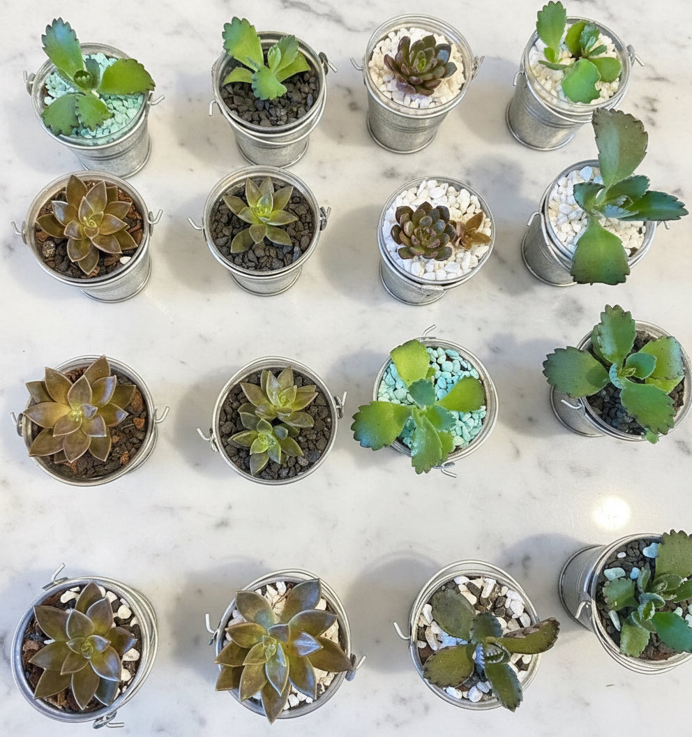 Adorable tiny succulents, surrounded by colorful decorative stones, showcasing a delightful assortment of succulent types, all contained in a charming silver bucket.